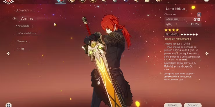 Lithic Blade fournit sept pour cent d’ATK et trois pour cent de taux CRIT à l’utilisateur pour chaque membre du groupe originaire de Liyue. Le jeu fournit déjà une pile à ce passif puisqu’il vient de Liyue, et le jumeler avec d’autres personnages de Liyue ne fera que le rendre plus fort.