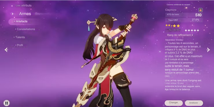 Serpent Spine est l’un des deux Claymores que vous pouvez obtenir après avoir déverrouillé et progressé dans le deuxième niveau du Battle Pass. En tant que telle, cette arme fournit le taux CRIT comme statistique secondaire, ce qui est rare parmi les armes quatre étoiles. Son passif augmente les DMG du porteur de 3 pour cent toutes les quatre secondes pendant lesquelles il est sur le terrain, pour un maximum de cinq cumuls ou un énorme bonus de DMG de 30 pour cent.