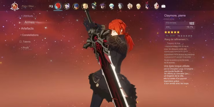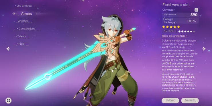 Skyward Pride offre une augmentation raisonnable de huit pour cent du DMG de Gaming. Mais plus important encore, il possède une ATK de base extrêmement élevée, étant une arme cinq étoiles, ainsi qu’une statistique secondaire ER élevée, qui vous aide à récupérer votre Elemental Burst plus rapidement.