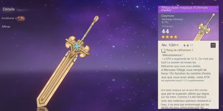 Son passif unique vous oblige à explorer réellement le jeu et à accomplir une série de quêtes. Par défaut, cette arme fournit 12 pour cent d’ATK, et aider Mélusines dans le village de Merusea peut vous donner plus d’ATK, jusqu’à 12 pour cent supplémentaires. Si vous avez pu récupérer tous ses matériaux de raffinement lors de l’événement, les effets sont doublés, pour un total de 48 % d’ATK.
