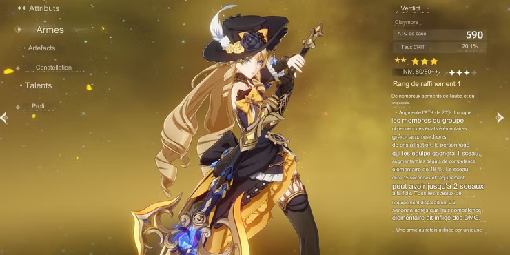 C’est une excellente arme pour le jeu car elle fournit une abondance de statistiques ATK, qu’il apprécie, ainsi qu’un certain taux CRIT pour une construction plus facile. Le seul problème avec cette arme est qu’elle restreint les options de son équipe. Heureusement, la plupart des supports qui fonctionnent bien avec lui viennent également de Liyue, comme Xingqiu, Yelan, Xianyun et même Xiangling.