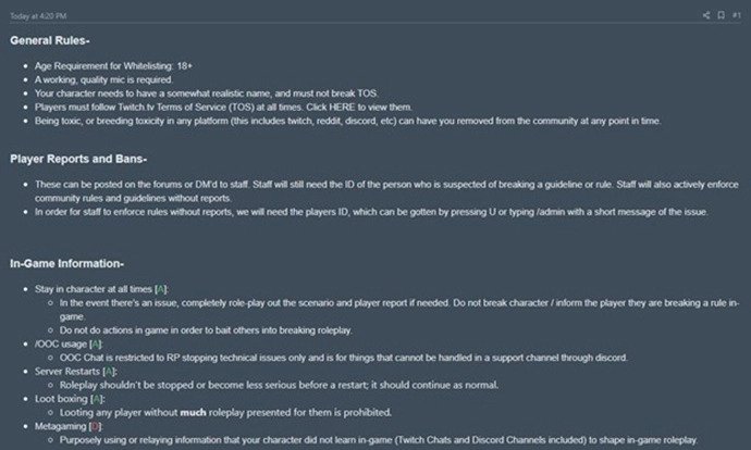Dès le processus de candidature, les joueurs sont informés que les « commentaires haineux », « briser le personnage » et « créer plusieurs personnages » entraîneront une pénalité et un bannissement, dans la plupart des cas. Le forum contient des règles et des instructions détaillées sur la manière de diriger son personnage dans le monde et d’interagir avec les autres joueurs et personnages.